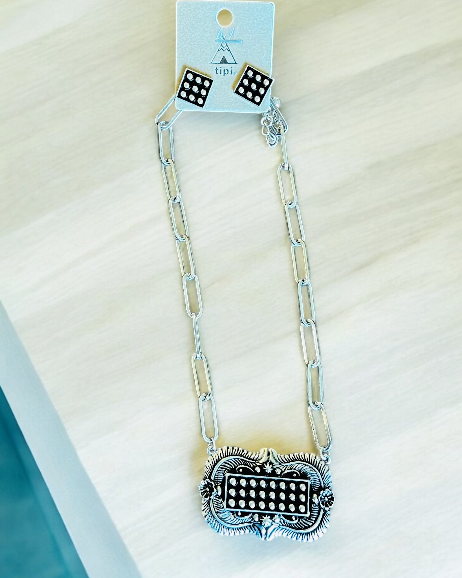 Get ready to elevate your style with our SERENA STUDDED BAR NECKLACE AND EARRING SET! This stunning set features a delicate bar necklace and matching stud earrings, both adorned with sparkling studs. Make a statement and add a touch of elegance to any outfit. (It's a steal of a deal with both pieces included!)