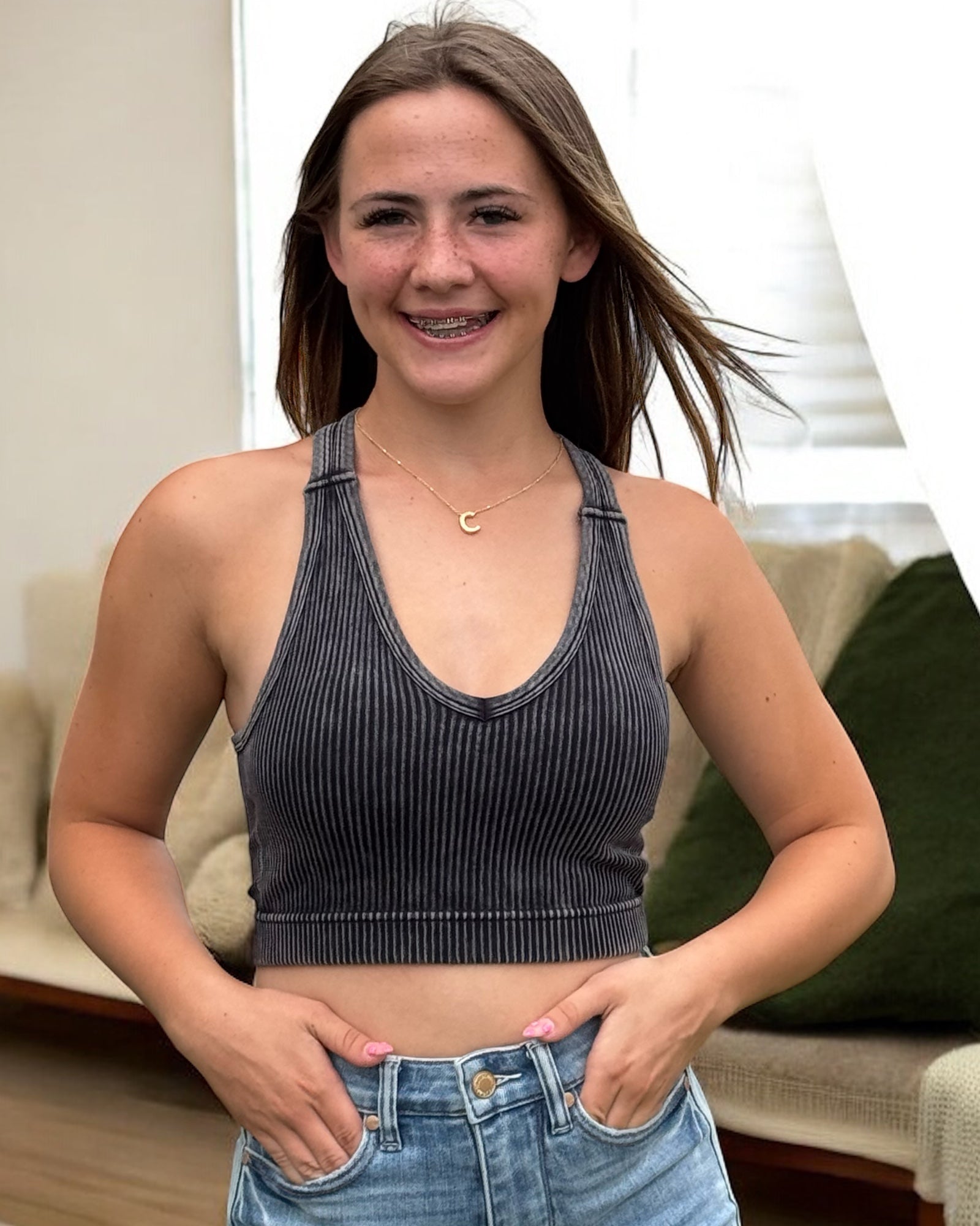 Get ready to turn heads with the Taylor Black Stone Washed Racerback! This effortlessly cool tank features a soft, stone-washed fabric that feels like your favorite vintage tee. The racerback cut adds a sporty twist, perfect for layering or rocking solo on sunny days. Whether you're out for a casual stroll or dancing through the weekend, this top brings comfort and style together with a playful edge.